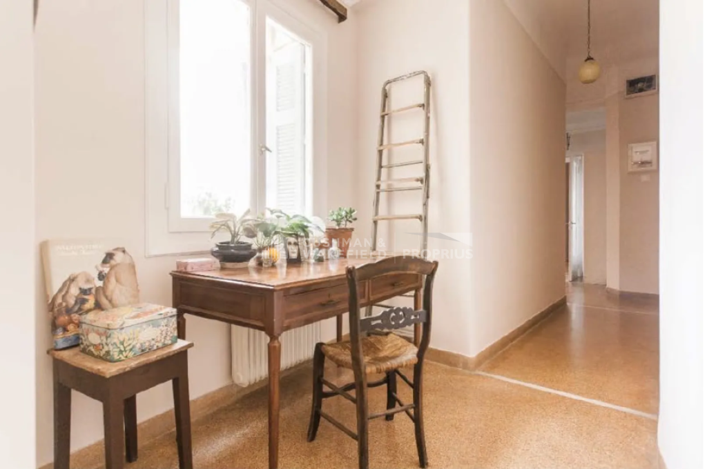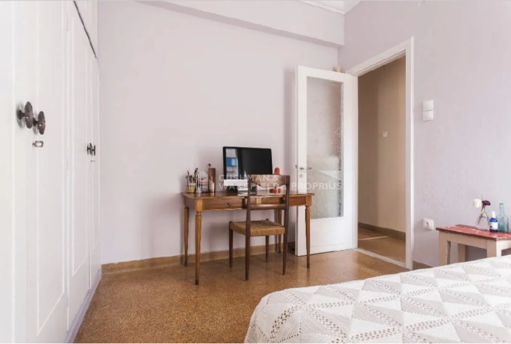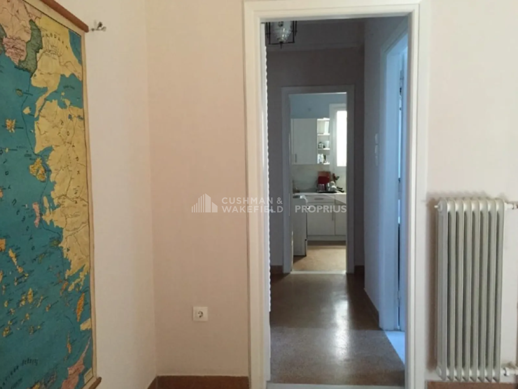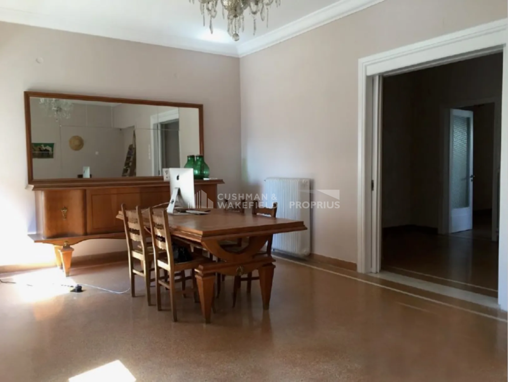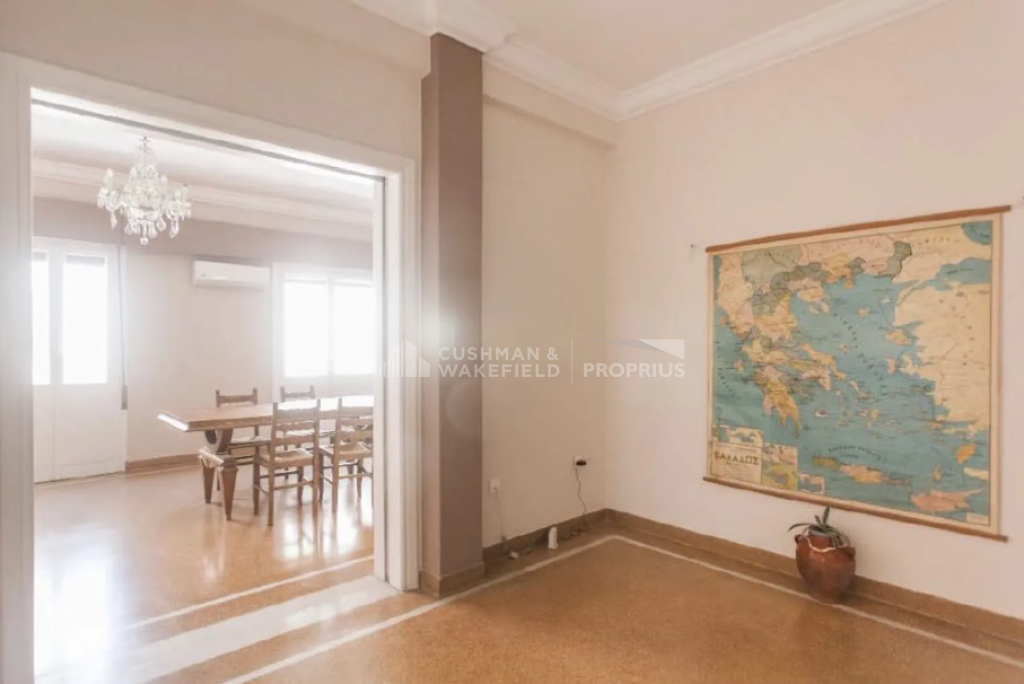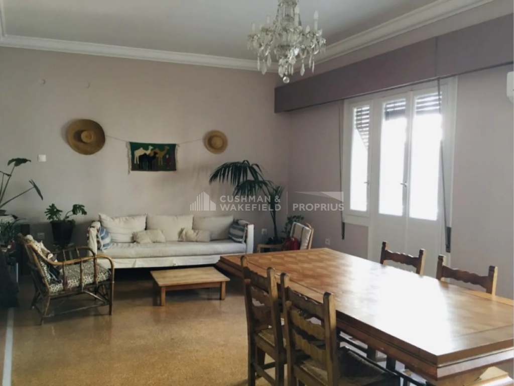 Features include wooden window frames, mosaic flooring, air conditioning, and a large terrace with awnings, enjoying panoramic city views and a direct view of the Acropolis with an open horizon. The building does not have heating or an elevator. The apartment is situated in a quiet location close to shops, a square, and public transportation, less than 500 m from Omonoia Metro station and less than 500 m from Thissio ISAP station.