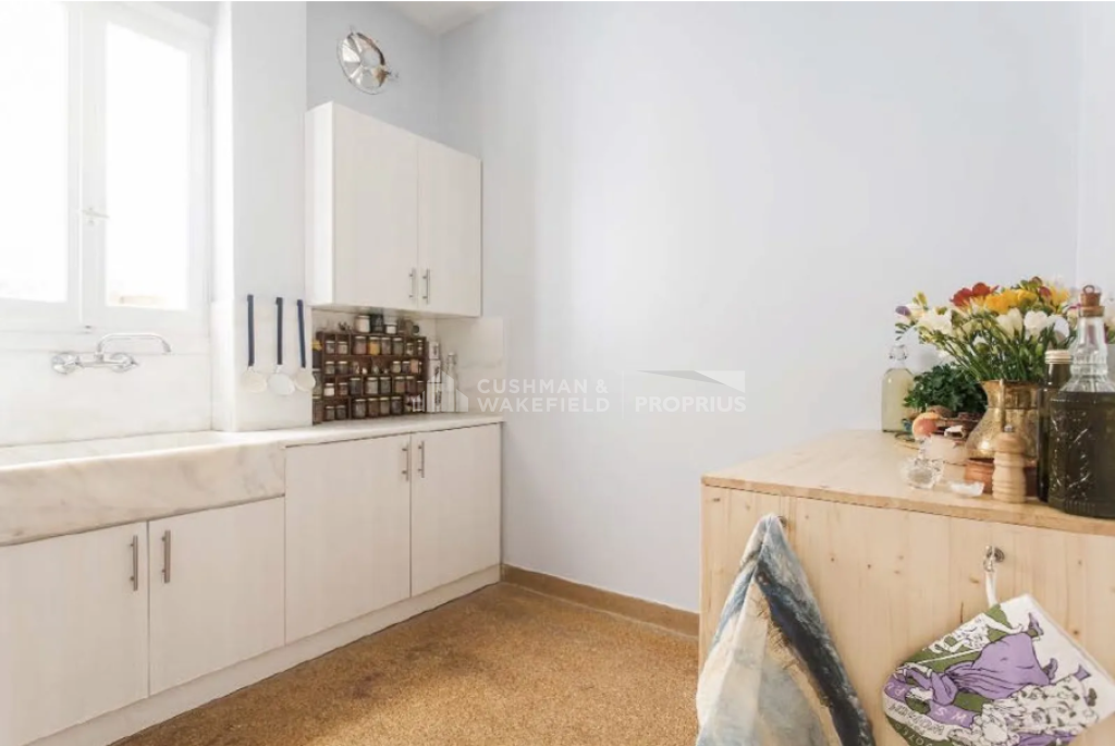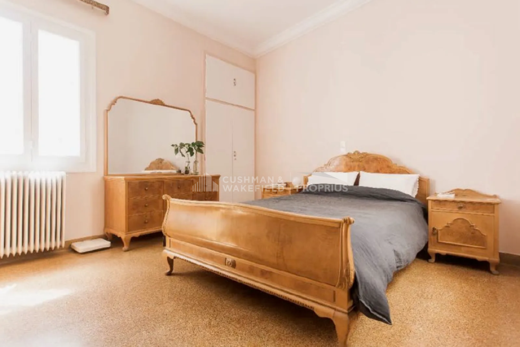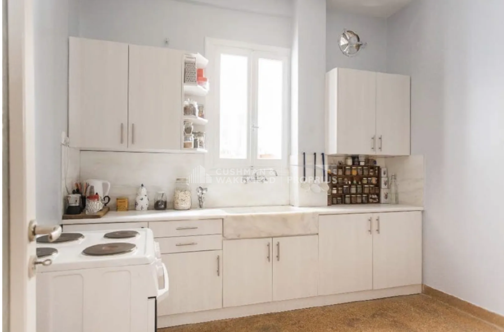 In Psyrri, a bright, dual-aspect penthouse apartment on the 3rd floor is available, offering 134 sq.m. of living space in a 1960 building. The property is partially renovated and maintained in very good condition. Its layout includes a spacious entrance hall, an open-plan living and dining area with windows and balcony access, a separate kitchen with natural light, three bedrooms with wardrobes and balcony doors, and a bathroom with a window.