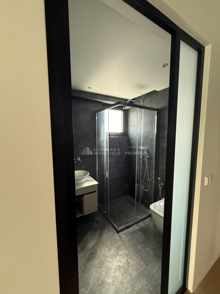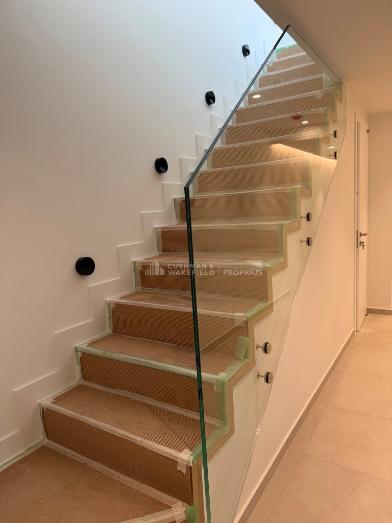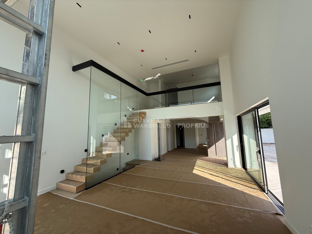 The property includes 3 master bedrooms, a spacious living and sitting area, 2 dining areas, a main kitchen and a kitchenette, a laundry room, and private parking. Comfort is ensured with underfloor heating using natural gas, autonomous air conditioning, internal staircase and elevator, as well as advanced fire detection and alarm systems.